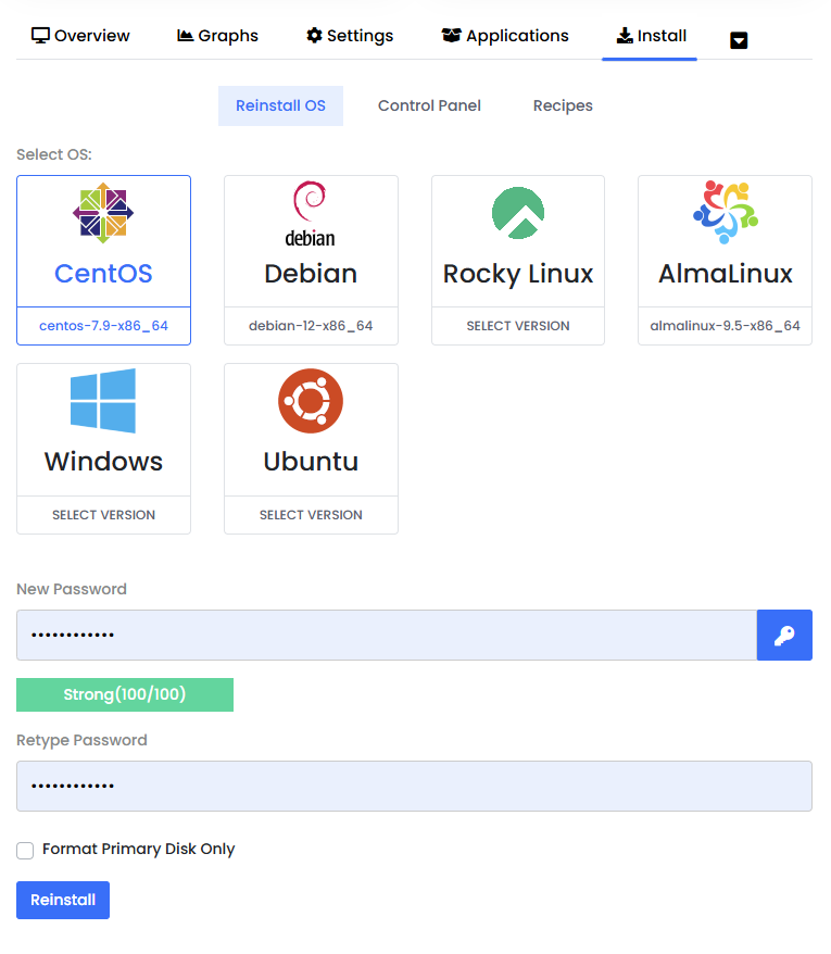 - Bước 3: Nhập mật khẩu mới để sử dụng sau khi cài lại hệ điều hành cho VPS. Sau đó, click Reinstall để cài lại hệ điều hành.